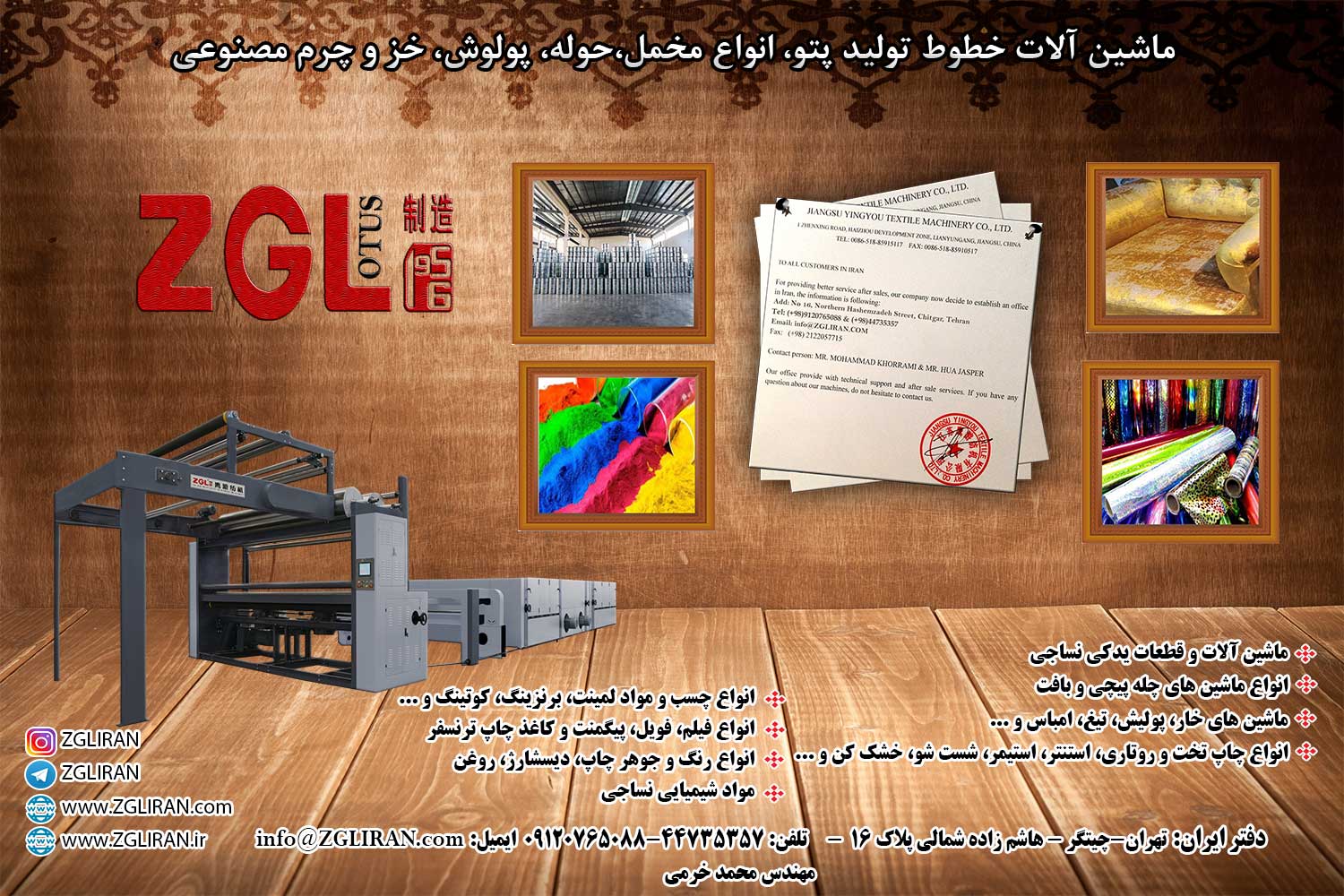 ZGL” چین”شرکتی با تکنولوژی پیشرفته (High-Tech) و یکی از بزرگ ترین تولیدکنندگان ماشین آلات نساجی در جهان است. این شرکت با بیش از50 سال سابقه در زمینه تولید ماشین آلات نساجی، پیشرو در زمینه تولید ماشین آلات تکمیل، چاپ و شست وشو می باشد. ZGL با داشتن متخصصین خبره، به طور پیوسته ماشین آلات و دستگاه ها را جهت بهبود کیفیت و ارائه خدمات جدید به روزرسانی می نماید. این شرکت با بیش از1000 نفر پرسنل فنی و در قالب 98 تیم مهندسی تخصصی اقدام به تولید ماشین آلات نساجی پیشرفته با سیستم CAD design وبا سیستم مدیریت شبکه رایانه ای می نماید. محصولات مجهز به سیستم های اینورتر، PLC و صفحه نمایش لمسی می باشند. ظرفیت تولید ماشین آلات تکمیل شرکت ZGL بالغ بر 2000 دستگاه در سال است. پس از گذاراز یک دوره ده ساله تحقیقات و نوآوری عدد شاخص اقتصادی مجموعه ZGLسالانه حدود 30 درصد رشد داشته و جایگاه نخست را در صنعت تولید ماشین آلات نساجی در چین دارد. محصولات این شرکت حدود 75 درصد از بازار ماشین آلات را در کشور چین در اختیار دارد.